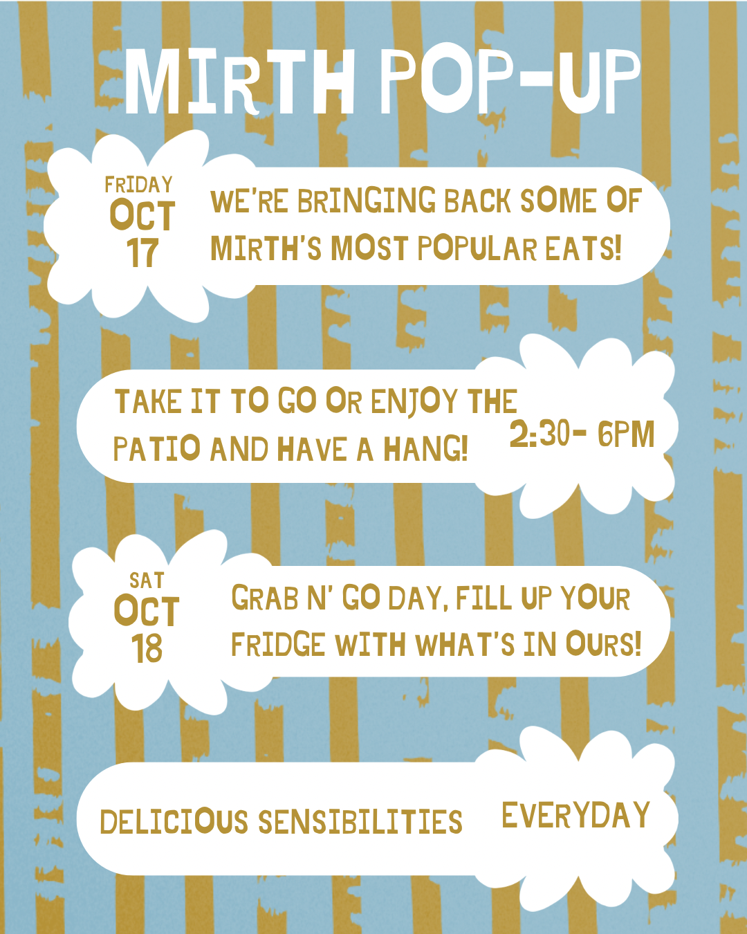 Our courtyard space is available for private events of up to 40 guests. Let us bring the food, vibe, and thoughtful touches MIRTH is known for.